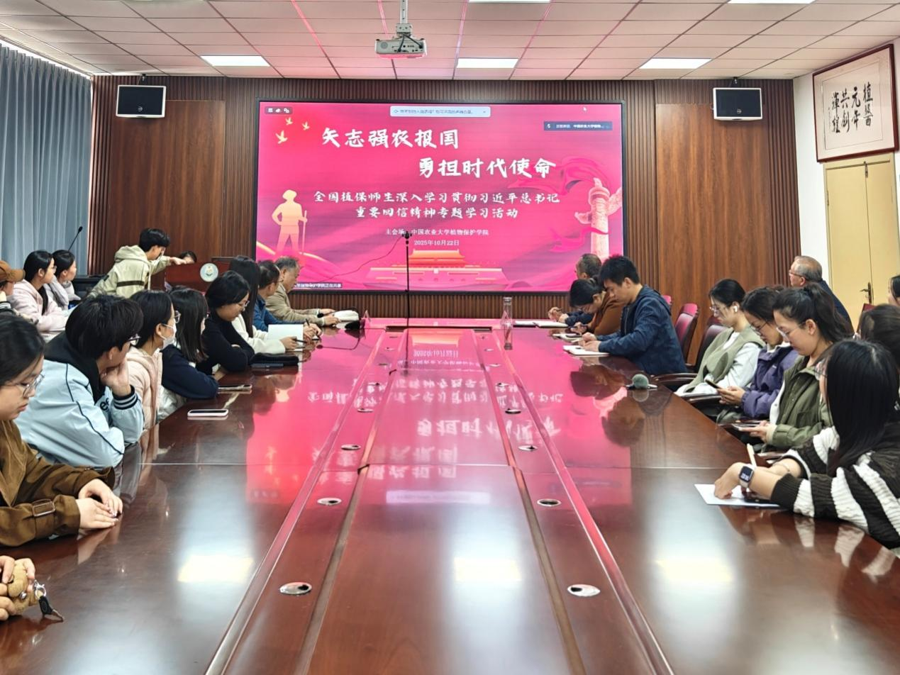 中国农业大学植物保护学院联合全国40个高校和科研单位共同举办“矢志强农报国,勇担时代使命——全国植保师生深入学习贯彻习近平总书记重要回信精神”专题学习活动。此次活动通过线上线下相结合的方式,有效引导全国植保师生深化认识、汲取力量,坚定了将学习成果转化为服务农业强国建设实际行动的决心。