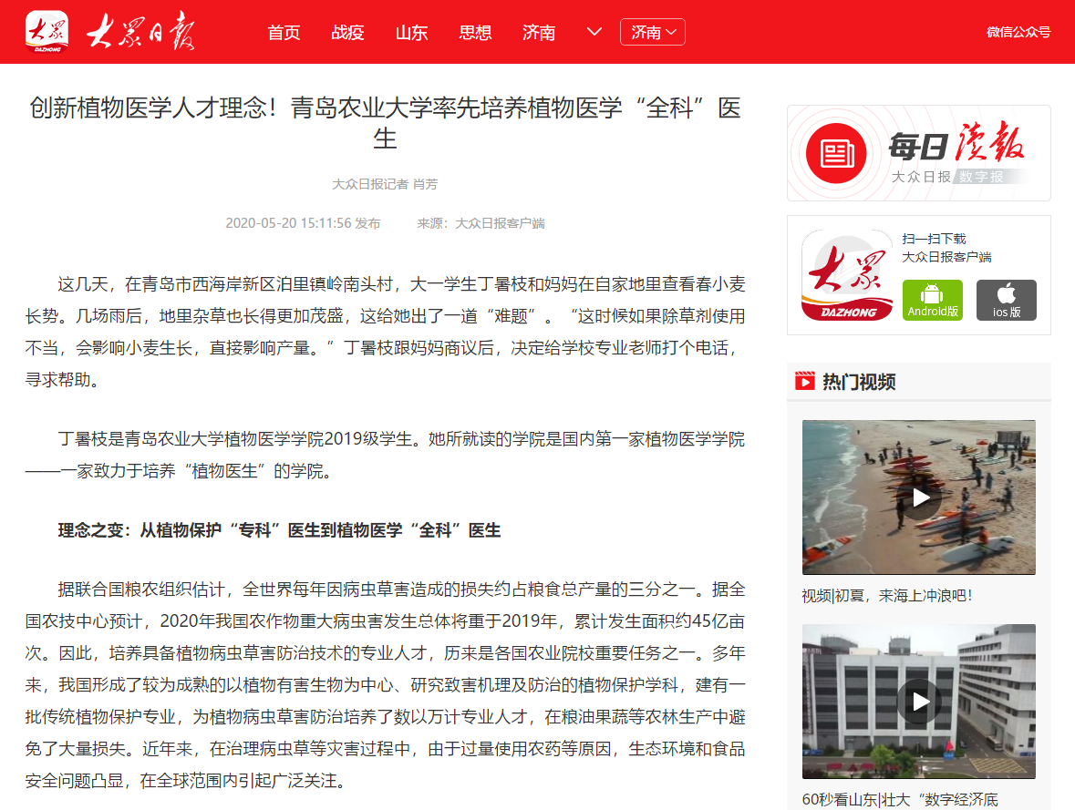 “植物医学专业人才也应像人类医学和动物医学人才那样,在遇到植物健康问题时分析出原因,并提供更加科学的解决方案”。该学院2019届硕士毕业生薛德胜毕业后在青岛当地一家作物营养公司从事技术研发工作,为保证植物健康提供各种产品和技术服务。在他看来,国家倡导对农作物及各类经济作物减药减肥增效的“两减一增”政策,是对作物生长管理认识的一个重要转变。“一棵植物的一生和人类一样,也会遇到各种各样的问题,如何让植物更加健康,需要‘植物医生’队伍的发展壮大和积极作为。”