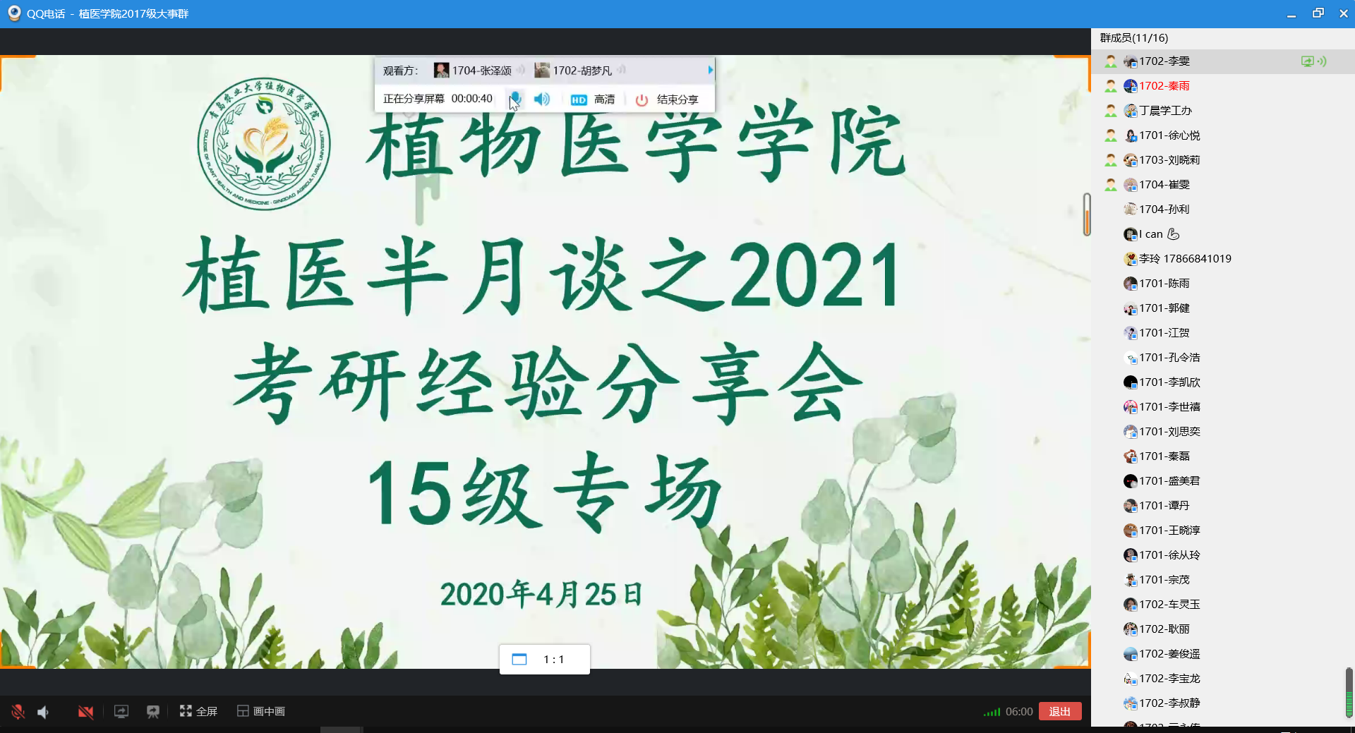 为切实做好2017级本科生的考研动员与指导工作,4月25日,beat365官网beat365官网举行植医半月谈之考研经验分享会——2015级专场,2017级全体同学参加会议。会议邀请了中国农业大学农业昆虫与害虫防治专业宗鑫、中国农科院植保所农业昆虫与害虫防治专业刘晓蓓、西北农林科技大学植物病理学专业张玲玉及华东理工大学农药学专业王鑫四位优秀毕业生进行经验分享。