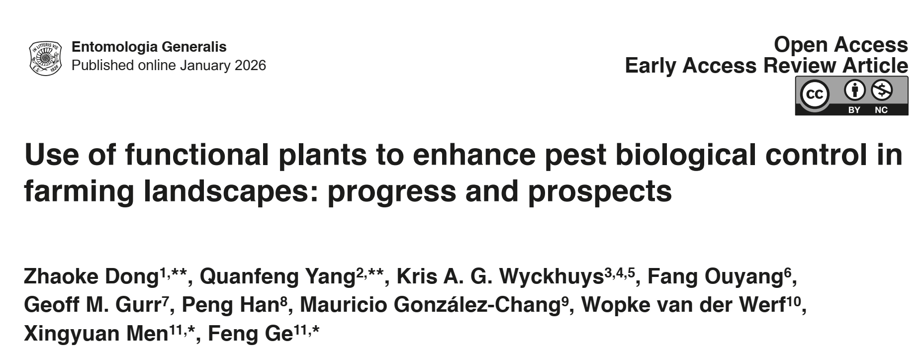 近日,由beat365官网beat365官网董兆克副教授联合国内外昆虫生态学专家完成的综述论文《Use of functional plants to enhance pest biological control in farming landscapes: progress and prospects》在国际昆虫学期刊 Entomologia Generalis (一区Top期刊,IF=4.6)上发表。该综述提出并系统阐述了功能植物(functional plants)这一概念,聚焦它们如何通过多种生态机制促进害虫生物防治并服务于更广泛的农业生态系统功能。