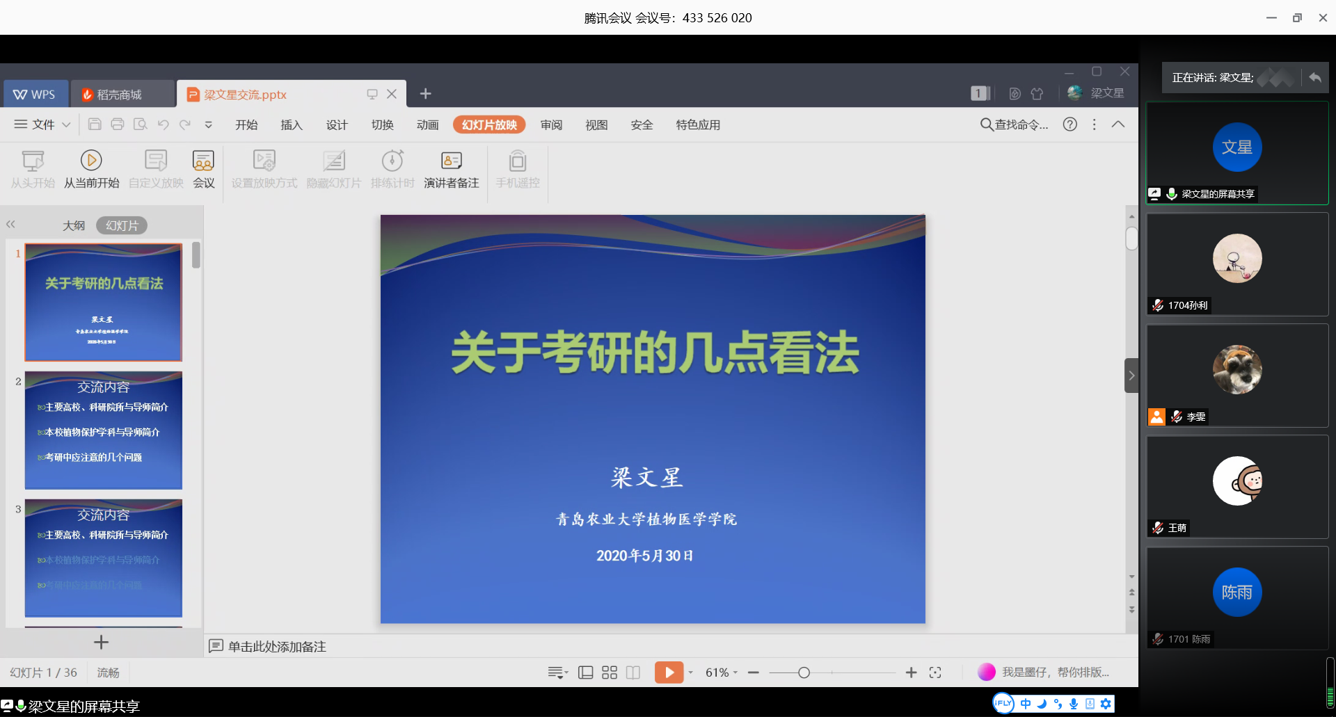 会议开始,梁文星以研究生导师的角度,通过主要院校与导师简介、本校植物保护学科与导师简介、考研中应注意的几个问题三个方面全面分析了报考院校,导师选择,研究方向等一系列相关问题。会上,梁文星针对全国主要农林院校著名研究团队做出介绍,建议大家综合个人实力、报录比、报考人数、地理位置、学风环境等因素,分散报考,降低内部消耗;精准报考,争取成功上岸。同时,梁文星在师资力量、科研项目、学院建设等方面同其他省属级农林院校做出对比。在考研报考应该注意的问题上,梁文星提出三点看法,一是要正确对待考研,正确认识考研,调整心态,合理复习;二是要尽早联系导师,并强调导师及研究方向的重要性;三是选择高校还是科研院所,梁文星通过研究规划、个人发展、院校活动等多方面进行分析,建议大家根据个人兴趣进行报考。会议最后,梁文星希望同学们能够尽早备考复习、稳住个人心态、合理安排时间、慎重选择院校,坚持不懈、刻苦努力,早日成为一名优秀的“植物医生”。