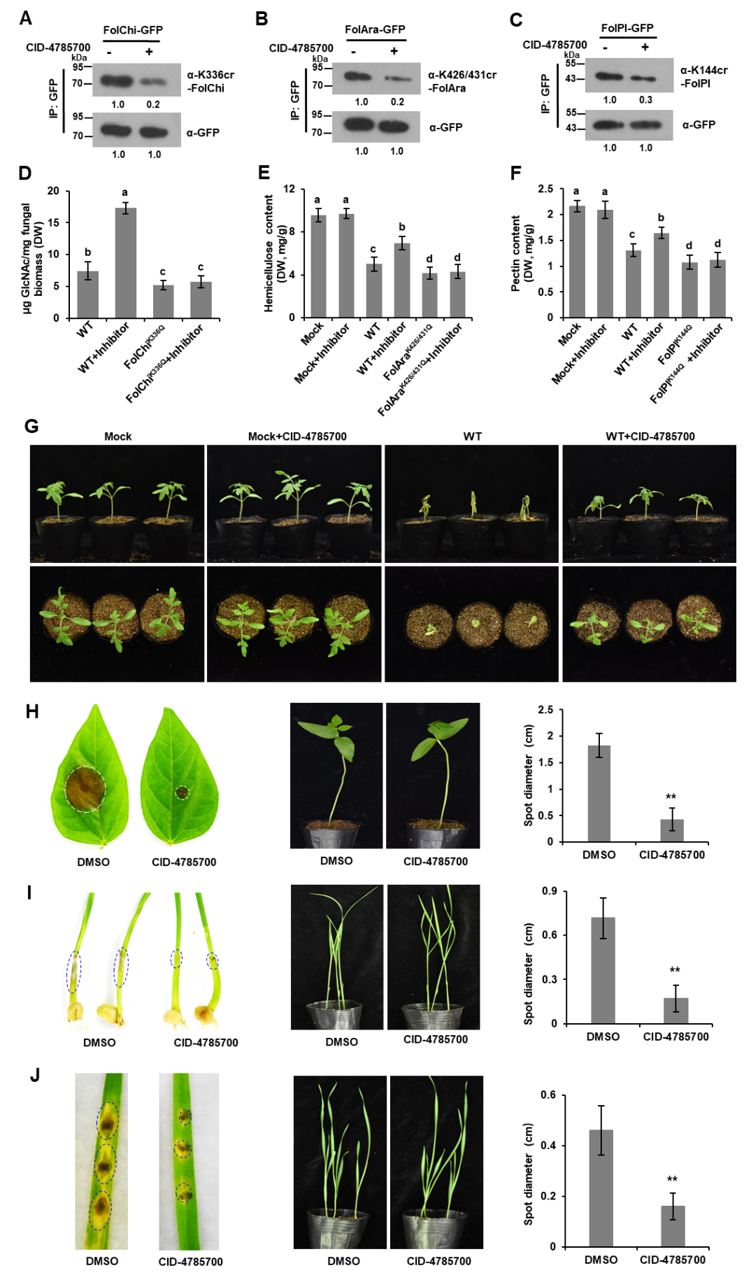 进一步通过Co-IP鉴定到与这三个效应蛋白互作的巴豆酰基转移酶FolRtt109,该酶在菌丝中表达较低,而在侵染过程中表达量迅速上调,这赋予了效应蛋白足够的巴豆酰化修饰,使其在侵染过程中充分发挥毒力。在此基础上,进一步筛选得到巴豆酰基转移酶FolRtt109的小分子抑制剂CID-4785700,实验结果表明,抑制效应蛋白的巴豆酰化能够降低包括枯萎病在内的多种真菌病害的发病,具有广谱性杀菌剂的应用潜力,针对这一靶标药物目前该团队已申请国家发明专利。