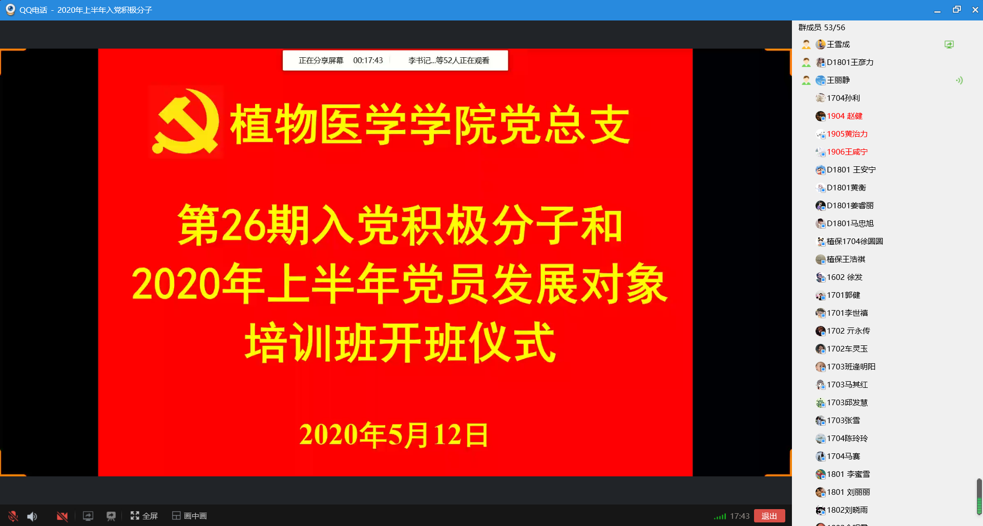 5月12日,beat365官网beat365官网党总支举行第26期入党积极分子和2020年上半年党员发展对象培训班线上开班仪式,党总支副书记、副院长李军出席,第26期入党积极分子和2020年上半年党员发展对象共52名学员参加,开班仪式由学院团委书记王丽静主持。